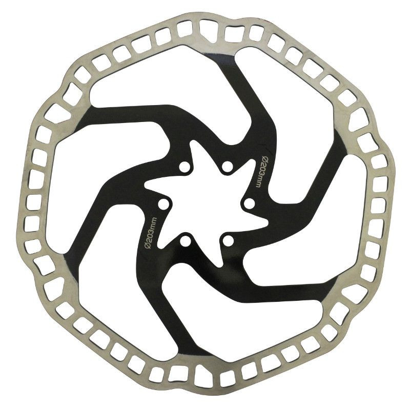Disque de Frein VTT 6 Trous Newton Brakco Compatible Shimano et Autres 203mm Argent Centre Noir + 6 Vis (Compatible Sur-Ron)